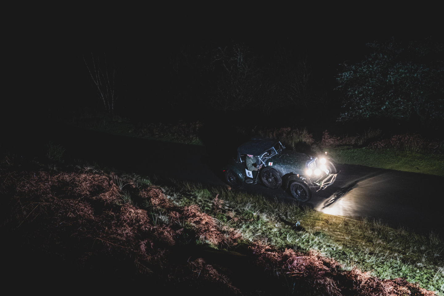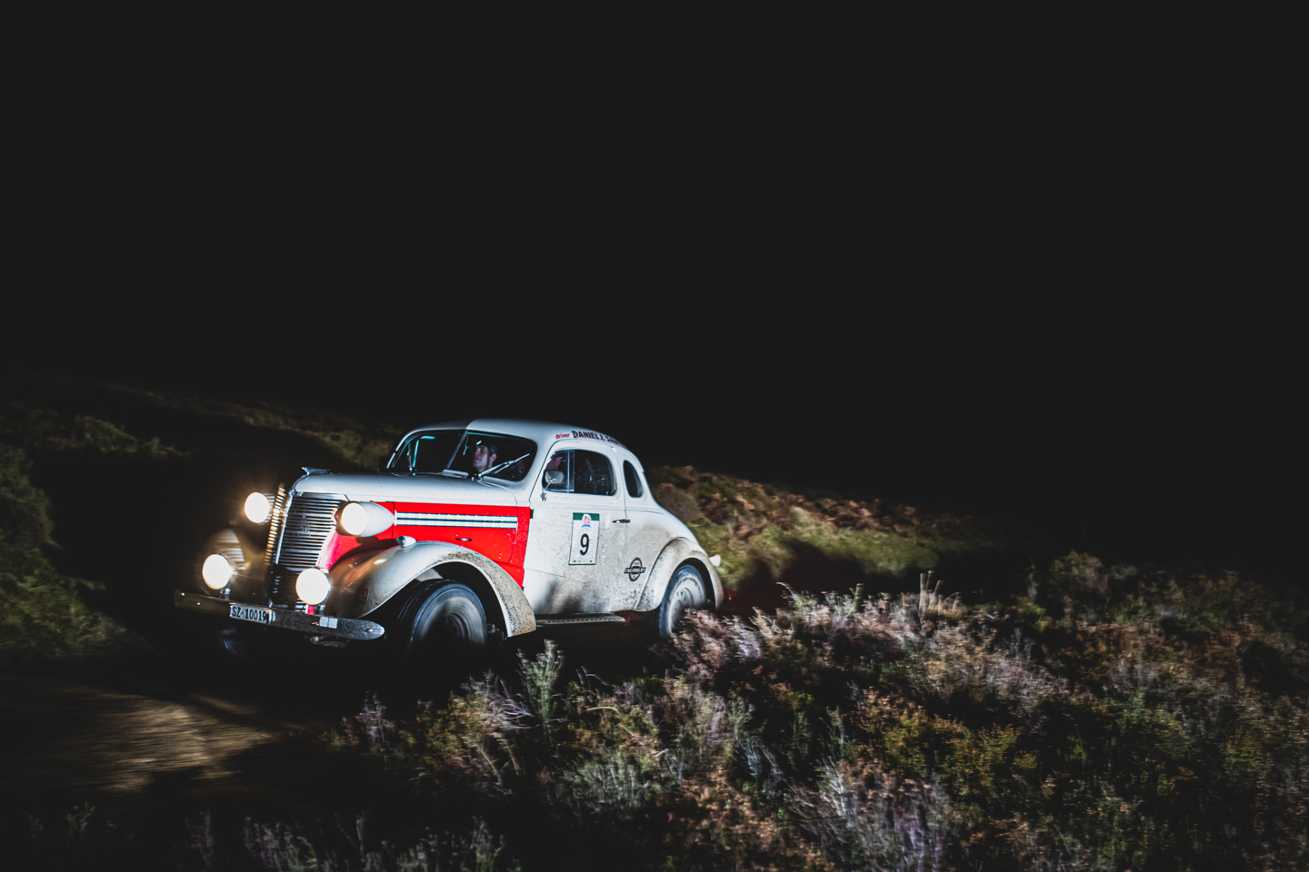 On into the second regularity, Abergwesyn and cars were climbing into the inky darkness as the silver rods of rain stabbed at their windscreens and bashed on their roofs. Surface water waited to ‘float your boat’ whilst the severity of the climbs and tortuous hairpins cooked the clutch on the Swiss Lotus Cortina of Stephane Michael Luethi and navigator Eric Tschannen. As media comms members downed cameras to help push the Cortina up the steep hill, Eric uttered the word Shei*** as the clutch found some grip and stuttered off up the hill leaving Eric with a long climb. The 1950 Land over of Susan Holyoake and Claire Lawson mean while chugged serenely by…….