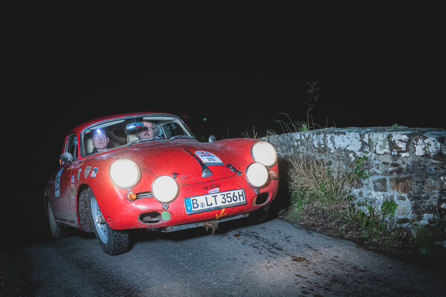 The Vintage cars were running first on the road and having negotiated the Bodmin Moor tricky triangles of regularity two successfully, a little white road caught many of them out. A shooting party had inadvertently blocked the little white road when parking in Panters Bridge which became a major cause for consternation. At one point six Vintage class vehicles converged at the spot, all at different angles as many other routes were tried but lead nowhere. Elliott Dale and Charlotte Ryall were getting frustrated after the third pass of the same junction, just as Stephen Owens and Nick Bloxham sailed through in their Porsche 911 having presumed correctly where the road would rejoin. Charlotte could be heard above the deep note of the big Bentley’s engine shouting to Elliott; “It has to be the right road!”
