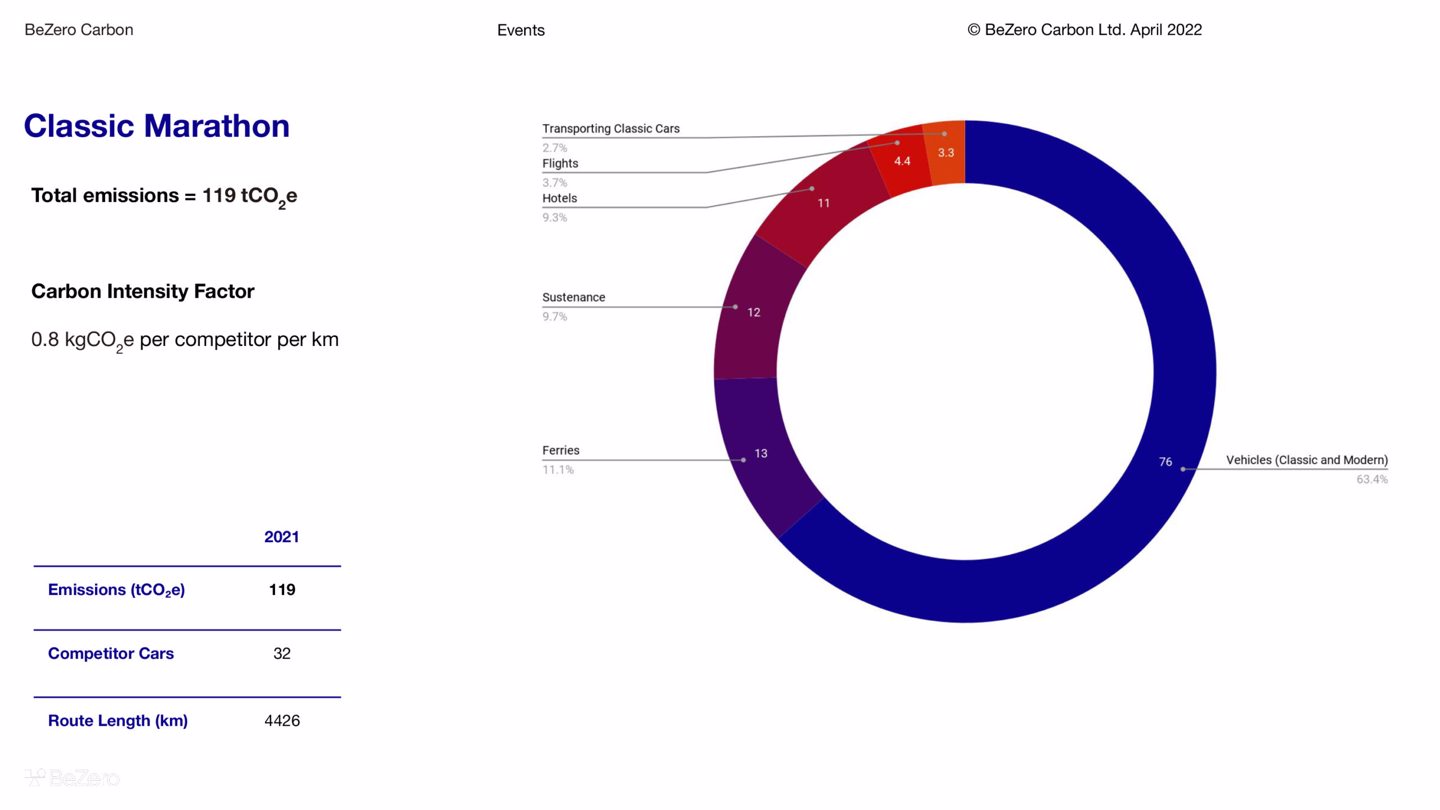 The total 2021 operational footprint for the entire company, including their historic rally events, measured 664 tonnes of tCO2e. Events contributed 491 tonnes of that figure, with The Classic Marathon emitting the highest amount of event emissions at 119 tonnes. The balance of the operational footprint at 172 tonnes includes company vehicles at 60 tonnes which represents 35 % of the figure. The full tonnage of increased emissions over 2020 (due to increased post covid activity) has been subject to investment grade AAA+ rated universal carbon credit offsets.