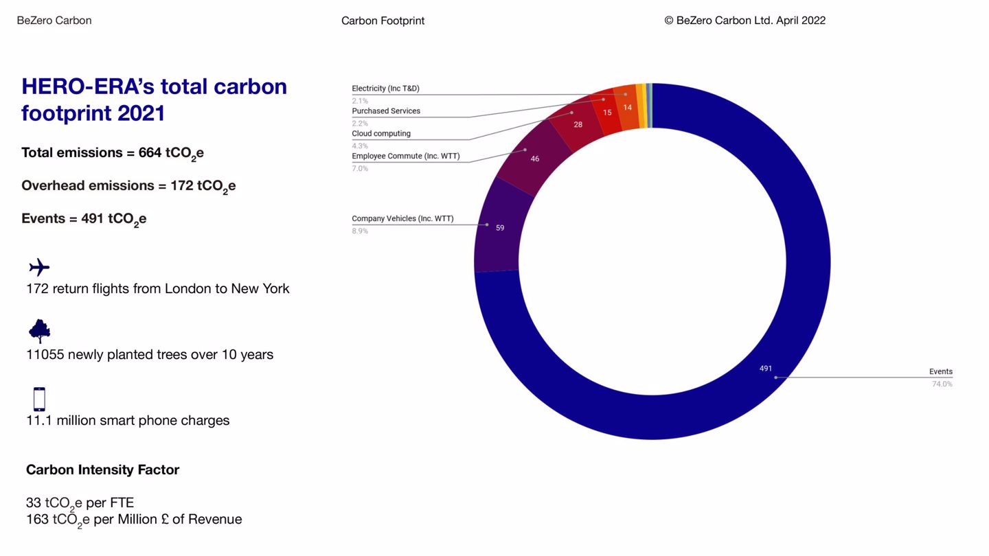 HERO-ERA’s total carbon footprint of 664 tCO2e for 2021 is the equivalent of 172 return flights to New York or 11.1 million smart phone charges, or the effect of 11055 newly planted trees over 10 years.