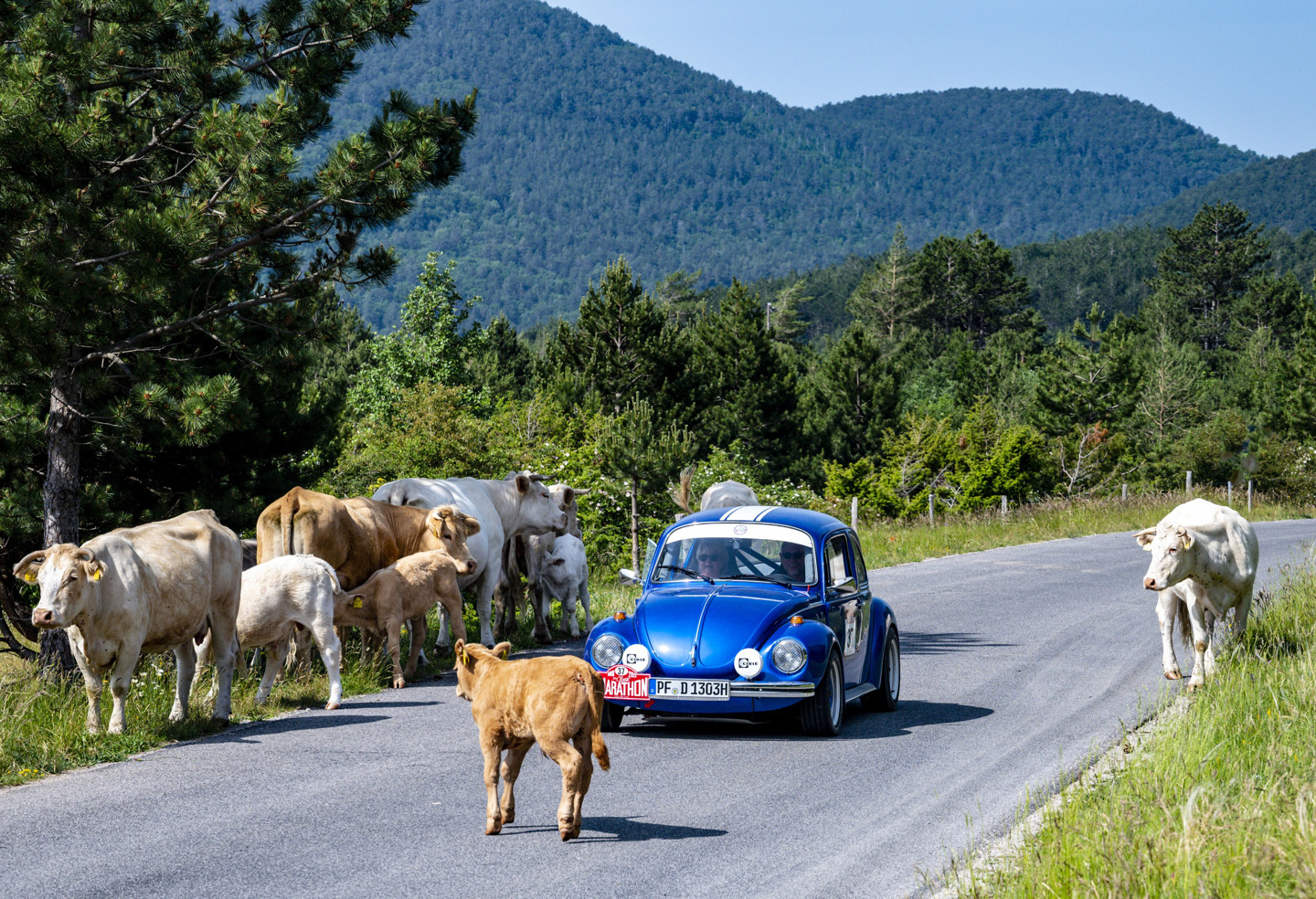 Another day where the first competitive element was a speed test, this time on the Koper Kart circuit, a spaghetti mess of a track that was somewhat roughshod in appearance. Its somewhat dystopian appearance may have encouraged one or two drivers to take a liberal approach to track limits, but then it’s hard to define the limit when the lines between asphalt and undergrowth are as blurred as they are at Koper. It made for some entertaining kerb hopping, and a special mention must go to 14. Philip Armstrong (IE) + Peter Rushforth (GB), bouncing and bumping the canary yellow Volvo PV544 from apex to apex, with little care for the car underneath them.