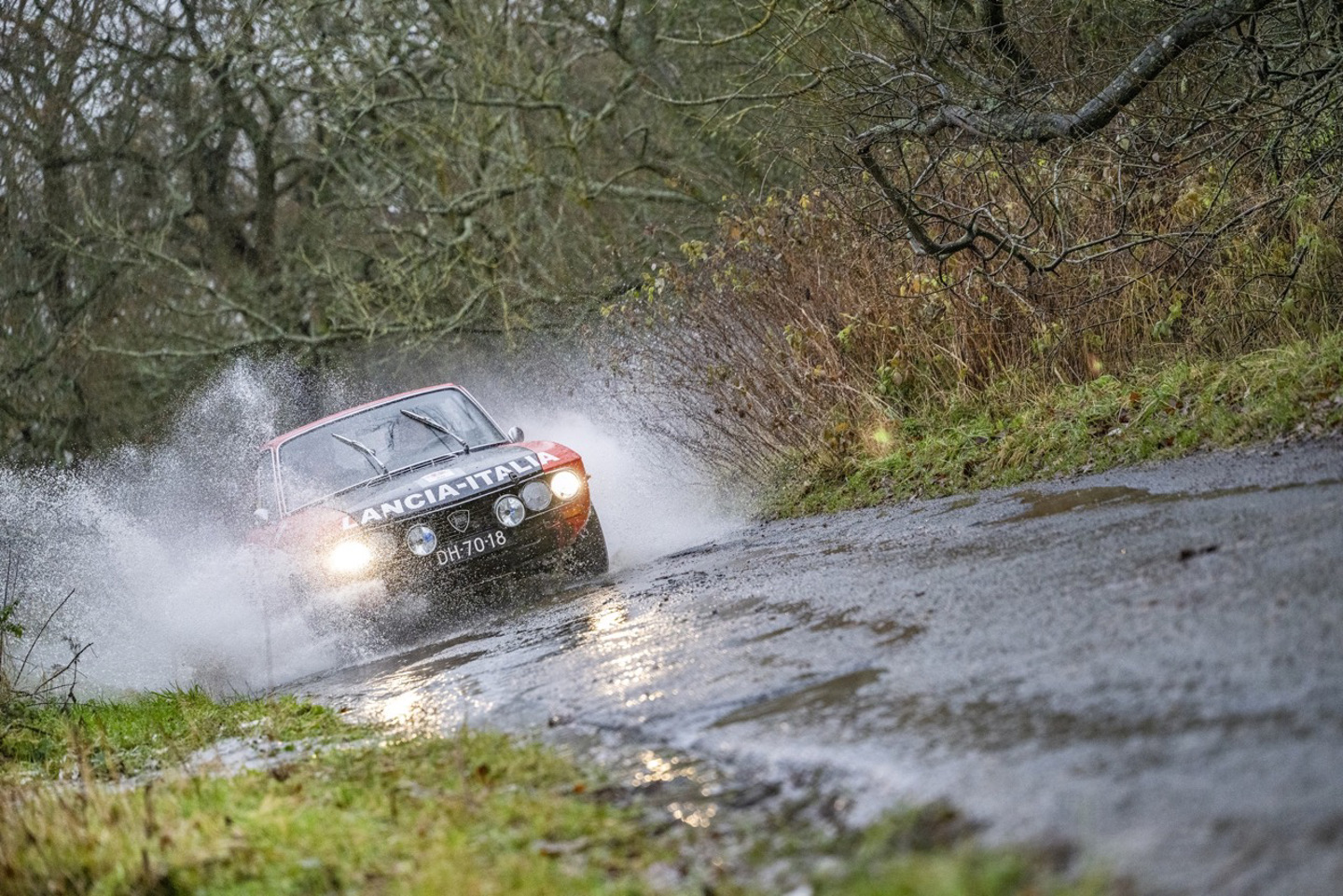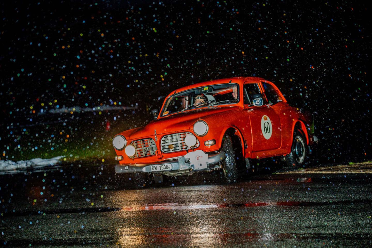 Two more regularities still remained before the evening would draw to a close, and with the temperature dropping there was more icy tarmac to contend with. Nick Maris and Henry Carr, fresh from being rescued from the clutches of an off-route excursion yesterday, fell victim to the slippery conditions, copying the exploits of the blue Escort before them, but luckily not descending as far from the side of the road. In the end the pair were rescued by one of the organization trucks and Manuel Dubs, in the number 43 Toyota FJ-40. Lo and behold whilst this was going on, car 32 turned up, seemingly teleported out of their hole and back into the rally.