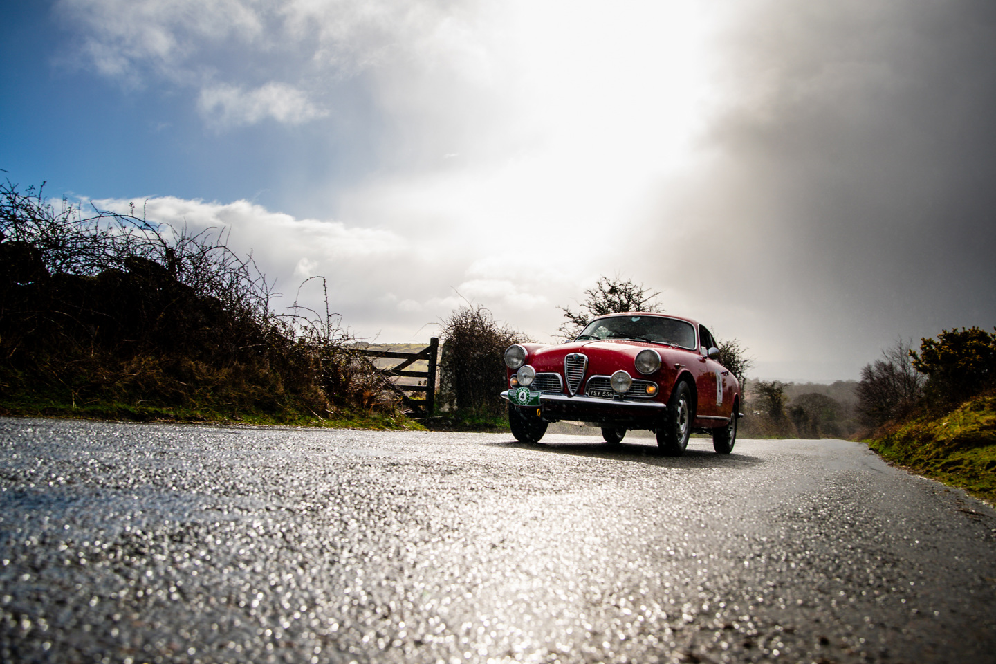 The weather was a factor for all to deal with. It was so mixed that at one stage crews experienced heavy hail stones on top of Dartmoor. Those in open top, vintage cars such as John and Natasha Lomas in their 1933 Riley Sprite were quite uncomfortable, John said; “We hit the hail on top of the hills, but in an open cockpit like ours, you have your head down trying to avoid the worst and maybe opening one eye, it was like trying to peek out of a Tiger tank! We experienced all weathers today, hail, rain, sleet, sun and high winds – all we needed was a plague of locusts to get the full set!”