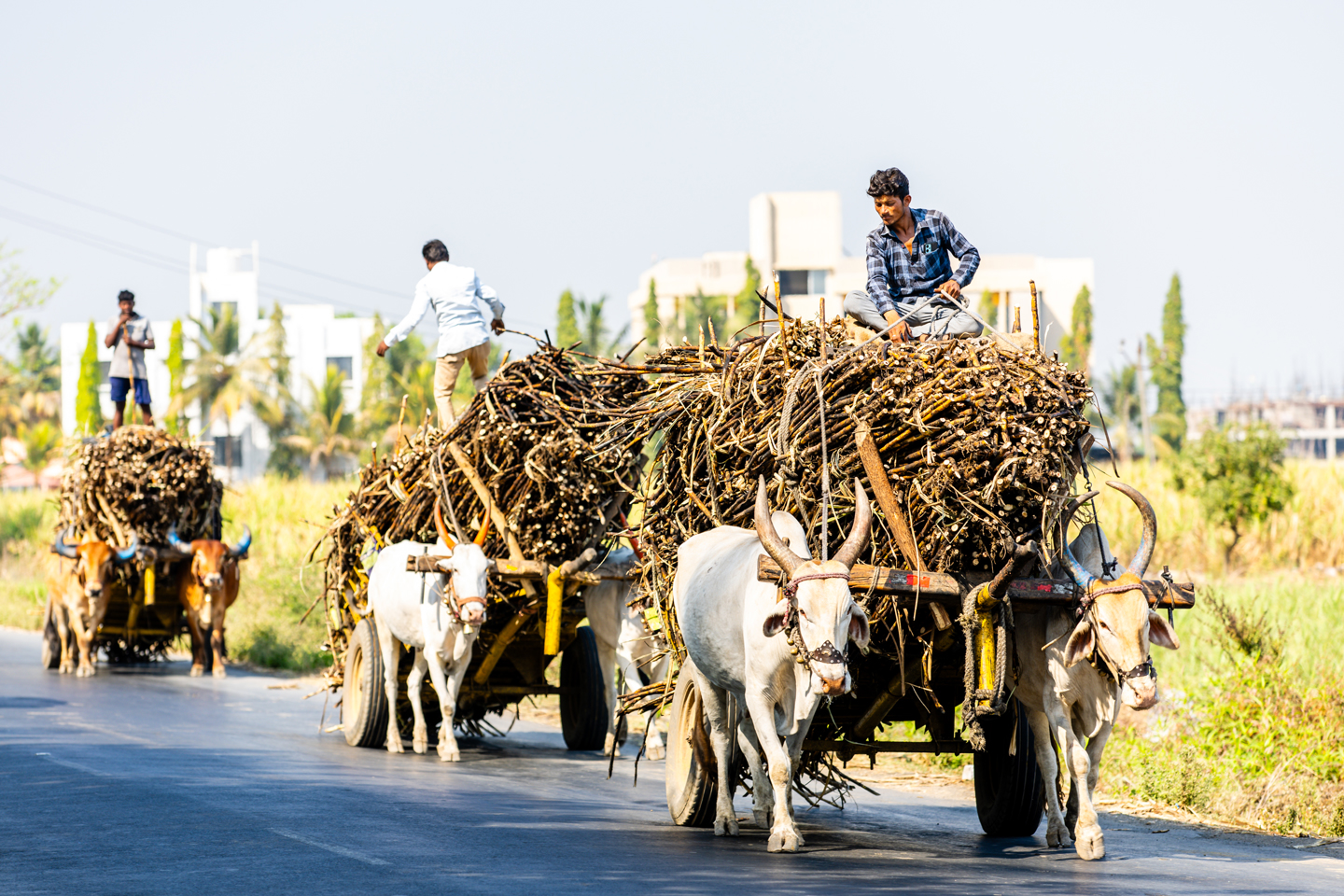 From here on in the level of chaos on the roads clicked up a notch, for the remainder of the journey into Vadodara. The final regularity of the day had to be cancelled, as it was just too busy to run safely or fairly and instead, we could all enjoy the sights, sounds and smells over the long run in. There were endless lines of Oxen, transporting towering carts of sugar cane to factories, alongside lorries doing the same. There were towns full of people, on roads lined with market stalls and street food vendors, with the noise and hubbub matched by the colours displayed across the roadside arcades. There were also plenty of roadworks, with a pipeline installation in particular causing more than its fair share of disruption and destruction, quite literally ploughing through the front of people’s homes.