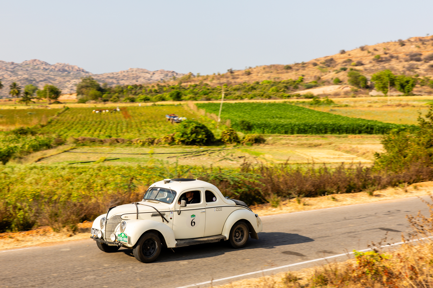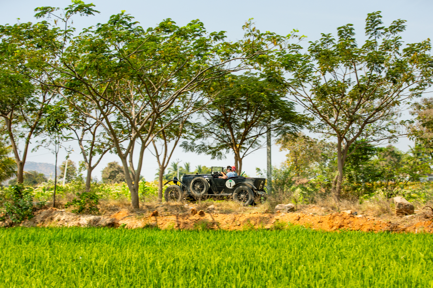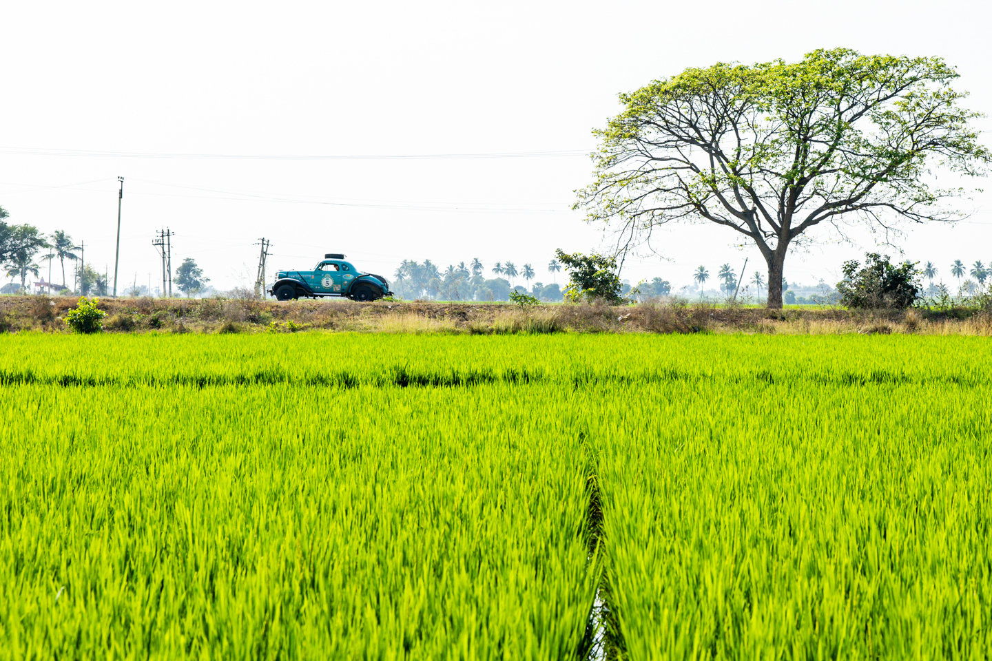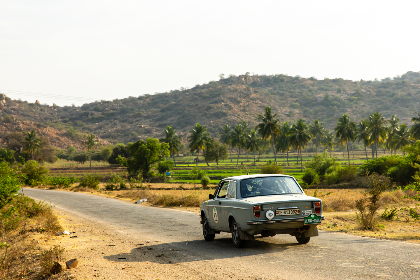 There was a decent amount of time at the control for the cars to cool down, though this wasn’t exactly an expedient process in the temperatures. There were still 200 clicks or so to go, with the days final and now only regularity almost at the very end of the day, just outside Hampi. The landscape began to change dramatically as the afternoon wore on, with paddy fields appearing, that would eventually spread as far as the eye could see, flanked by palm trees and occasionally other crops as well. The vivid green of the crops was supercharged by the hot and high sun, but by the time the reg came around the great orange ball was beginning to sink a little.