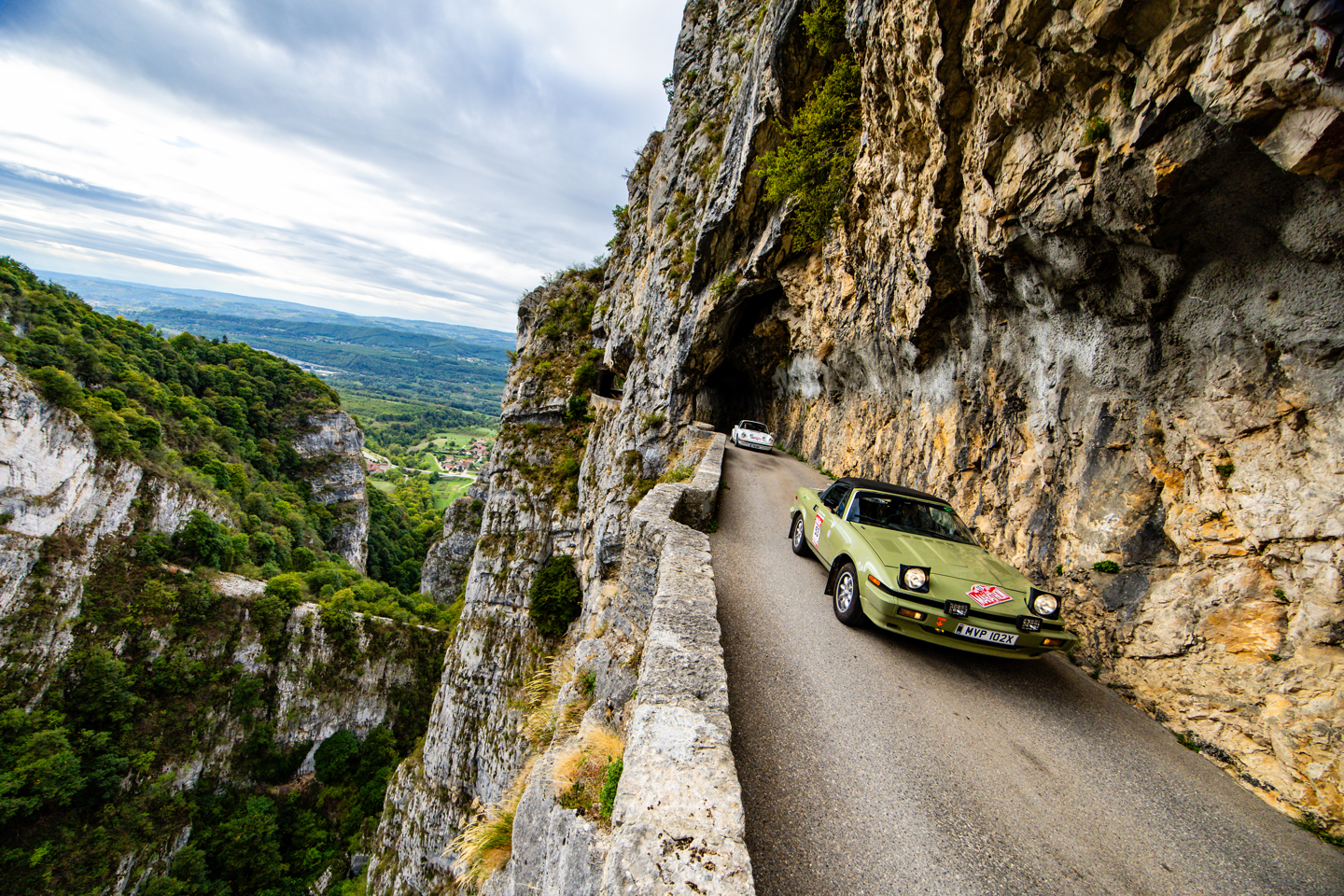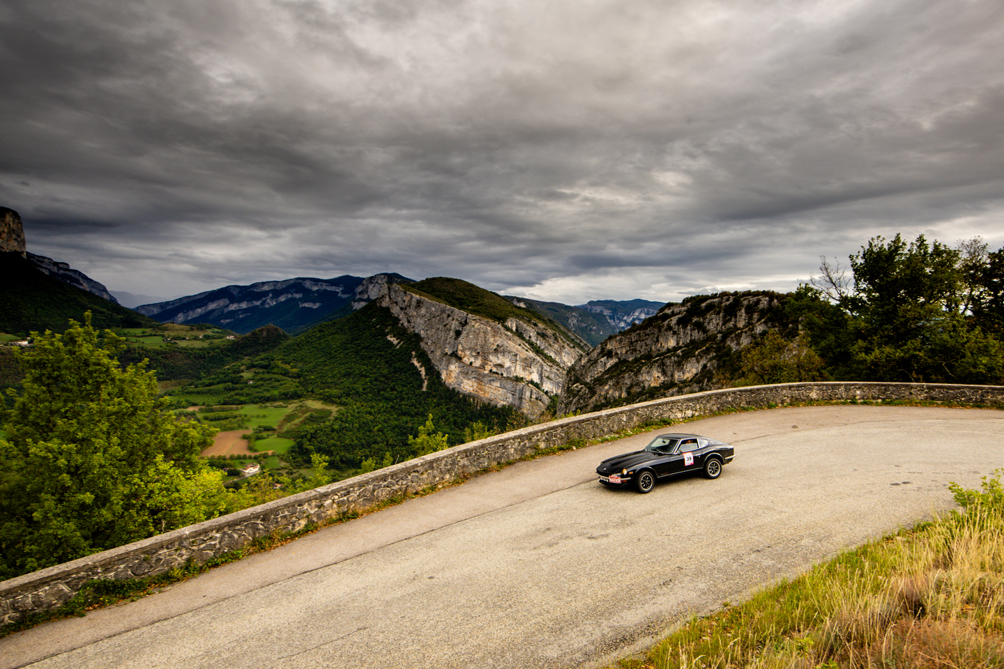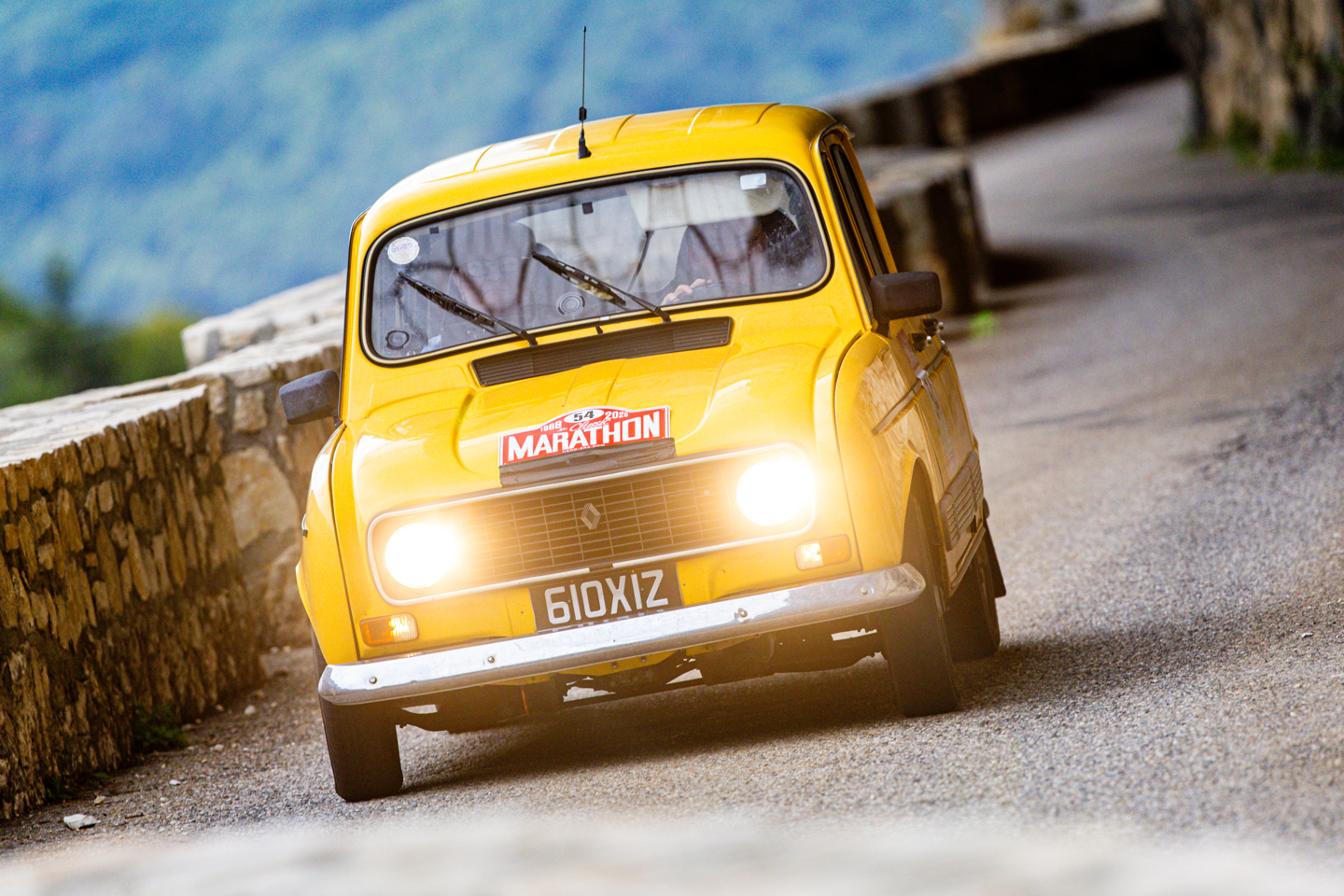 The run up to the fifth regularity was one of the day’s highlights, with a sharp climb out of the L’Isère valley up to the spectacular balcony road of the Gorges du Nan. Anyone with an aversion to heights would not have been advised to look over the edge of the stone walls that lined the road, best to keep eyes on the road and avoid any oncoming traffic on the narrow tarmac that cut around and through the walls of the gorge. After this brilliant piece of road it was easy to forget there was still a reg to complete, which was a climb in itself, that took the road higher still, though without the dramatic drops. A keen foot was needed to propel the lesser powered cars up the climbs whilst maintaining the required speed, a responsibility Renault 4 driver Vincent Hayes was taking very seriously, indeed the machine was rolling so much through the corners rumour has its navigator Peter Rushforth was getting his knee down on the apexes.