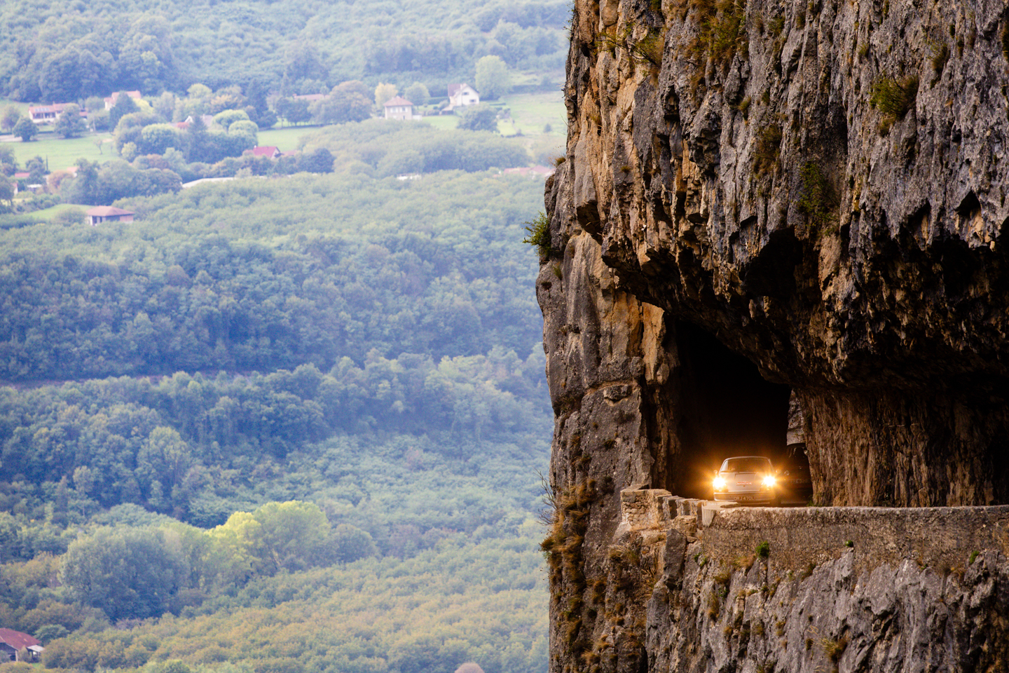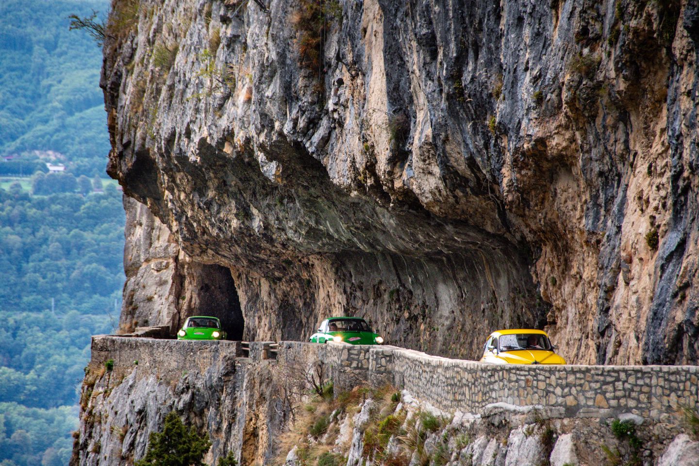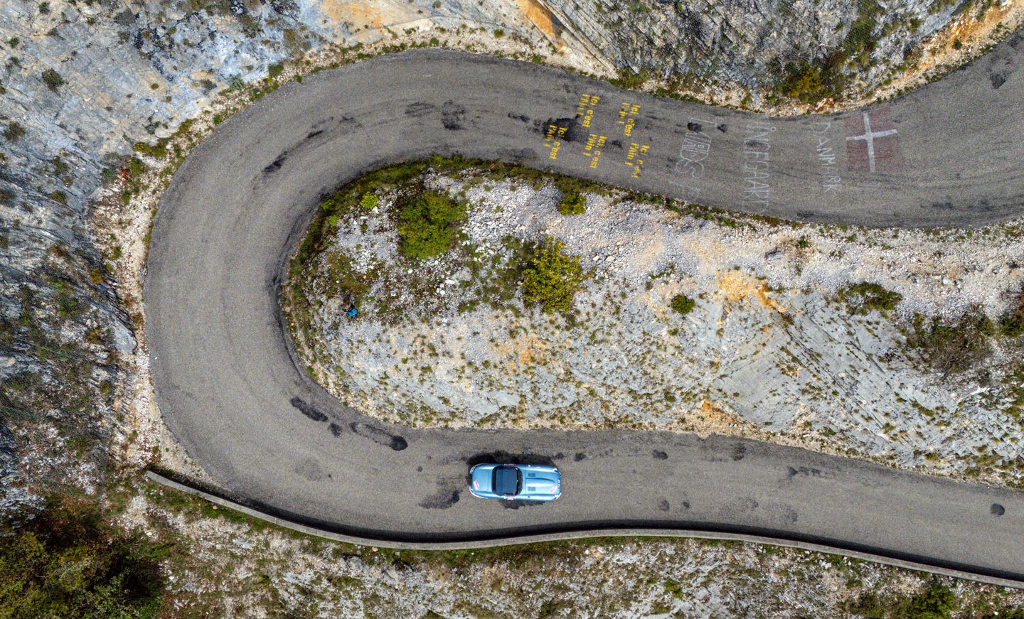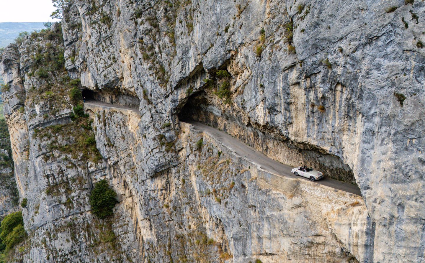 The run up to the fifth regularity was one of the day’s highlights, with a sharp climb out of the L’Isère valley up to the spectacular balcony road of the Gorges du Nan. Anyone with an aversion to heights would not have been advised to look over the edge of the stone walls that lined the road, best to keep eyes on the road and avoid any oncoming traffic on the narrow tarmac that cut around and through the walls of the gorge. After this brilliant piece of road it was easy to forget there was still a reg to complete, which was a climb in itself, that took the road higher still, though without the dramatic drops. A keen foot was needed to propel the lesser powered cars up the climbs whilst maintaining the required speed, a responsibility Renault 4 driver Vincent Hayes was taking very seriously, indeed the machine was rolling so much through the corners rumour has its navigator Peter Rushforth was getting his knee down on the apexes.