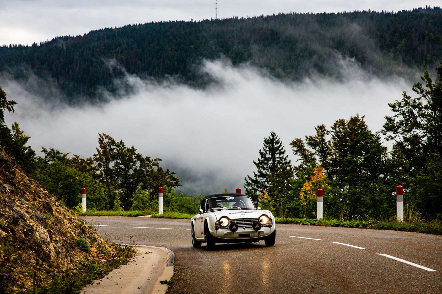After all this there was another regularity that took the cars over the famous high pass of the Grand Colombier, with stunning views at the top and a tricky descent down through the forest and mist, with many a bicycle and motorcycle to dodge, before each crew was able to stop for a well-earned break from the car at lunch. After a chance to catch their breath, the afternoon would see a further two regularities being contested by this year’s crews, though there would be plenty of transit between them, such was the distance covered today.