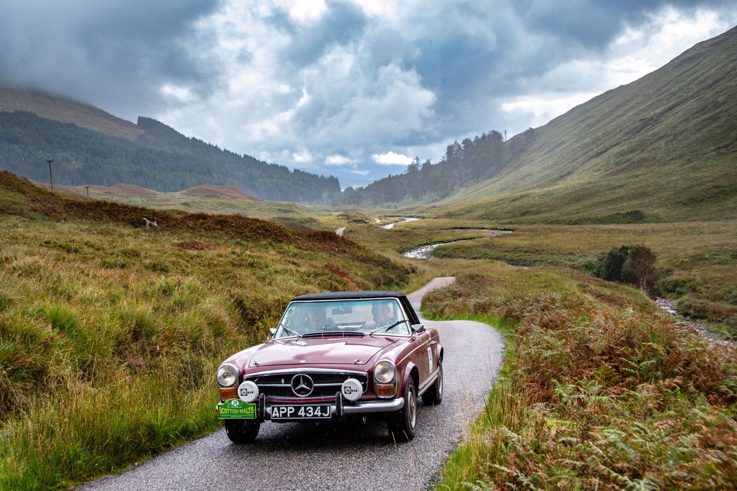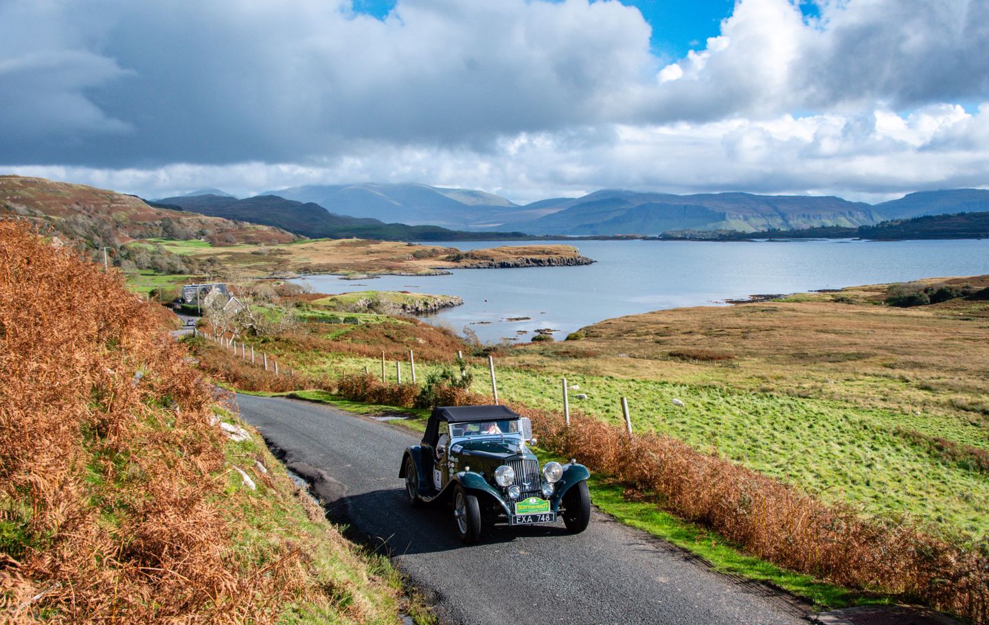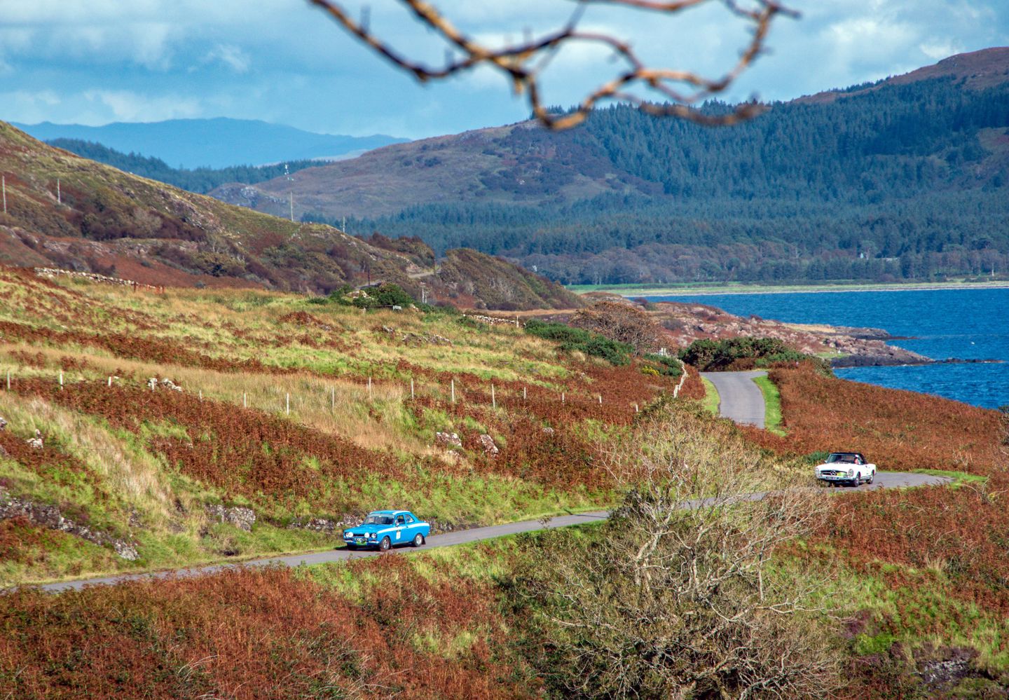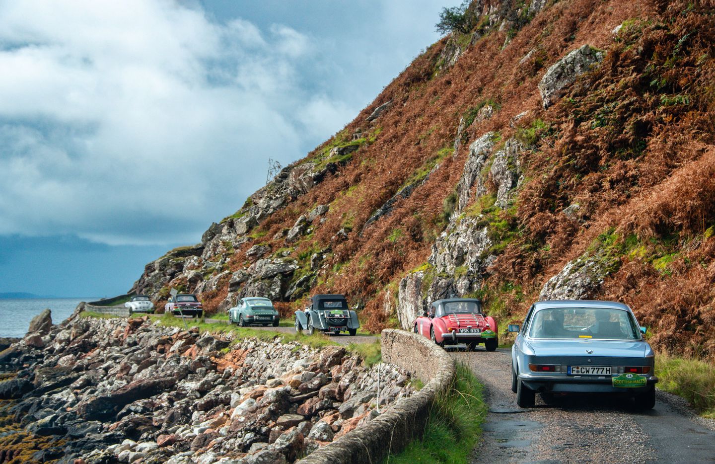 Most had met some traffic on the regularities at some point, but everyone loved the superb coastal and mountain roads that led them to the finish of day four in Tobermory. Gill and James Holt rose to fourth in their Pagoda Merc as great sailors Louise and Peter Morton manage to keep focused for fifth in their Rover P6 despite all the tempting waters and sailing boats around them on Mull.