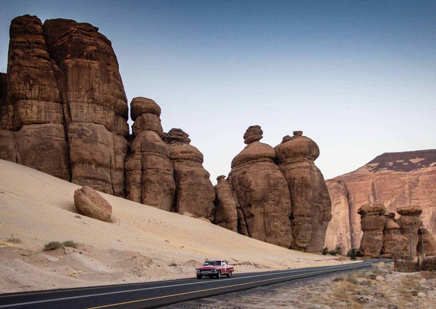 It isn’t just the varied landscape that is spectacular, Saudi Arabia is full of other wonders too, both ancient and modern. The rock tombs at Hegra, and the Maraya, the world’s largest mirrored building that serves as a giant optical illusion are just two of the highlights of our journey, not to mention a lap or two of the Grand Prix circuit to kick things off!