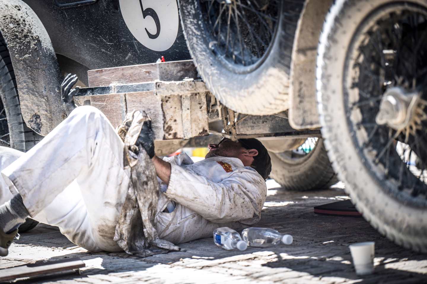 At the end of each hard day, whether recovering from driving in rain, heat exhaustion, or a battering by sandstorms which had blown tents away, repairs and maintenance had to be carried out on the 1926 Bentley no matter what time of day or night. Without the grit and determination to carry on, the Paris finish line and the record would not have been attained.