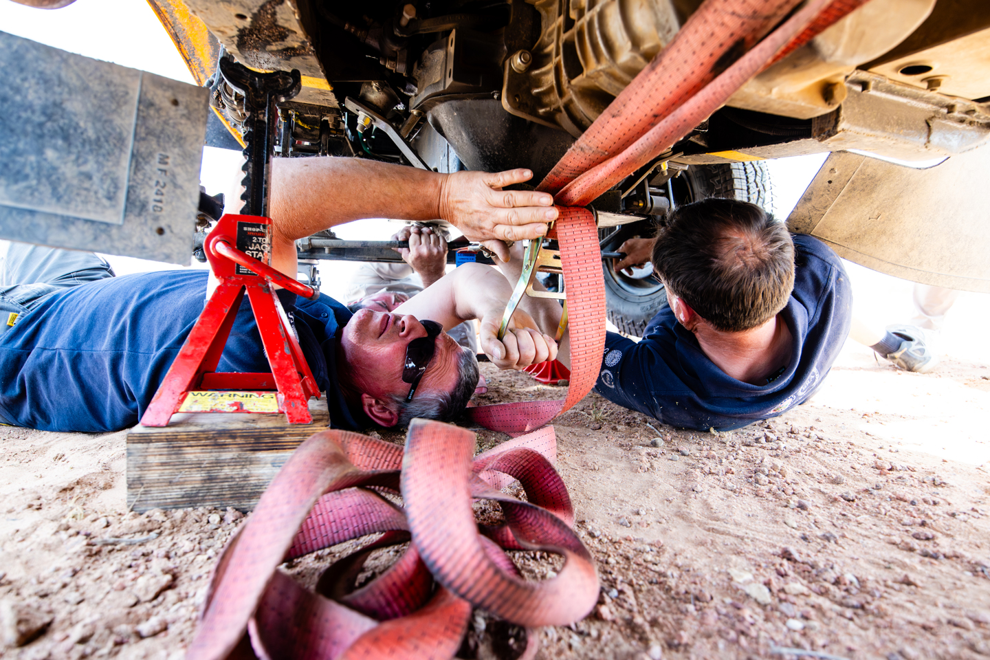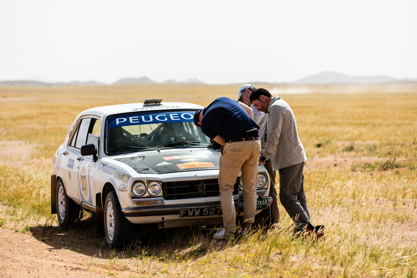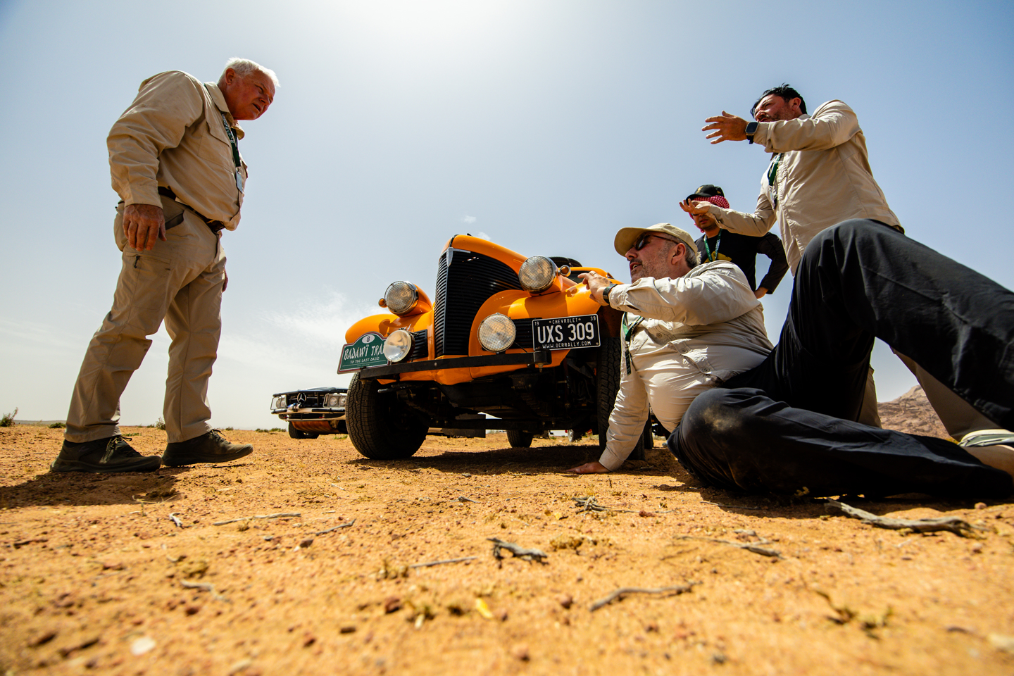 The final STC of the day was in another area of desert scrub, with a fairly simple loop around one of the granite hills that pop up erratically throughout the desert. Despite the loop being far less complicated than the mornings TC section, it seemed to be causing more problems for the crews, with several taking wrong tracks both at the start and close to the end, including Peter and Debbie Fitzcharles, attempting to chase down that first place. Their error cost them 30 seconds of penalty, as well as a later than planned return to base as they bent the steering arm of the Fangio. Of course, where crews are in trouble, others will help, and in this instance Kurt Deklerck and Patrick Debusseré, and Yang Zhan and Jason Zhe Ren both stopped to help with the repair – or at least help with getting the car jacked up and ready for the Sweeps arrival. Eventually the arm was straightened with nothing more complicated than a ratchet strap and the orange Chevy was on the road again, after another fantastic example of the camaraderie amongst the group.