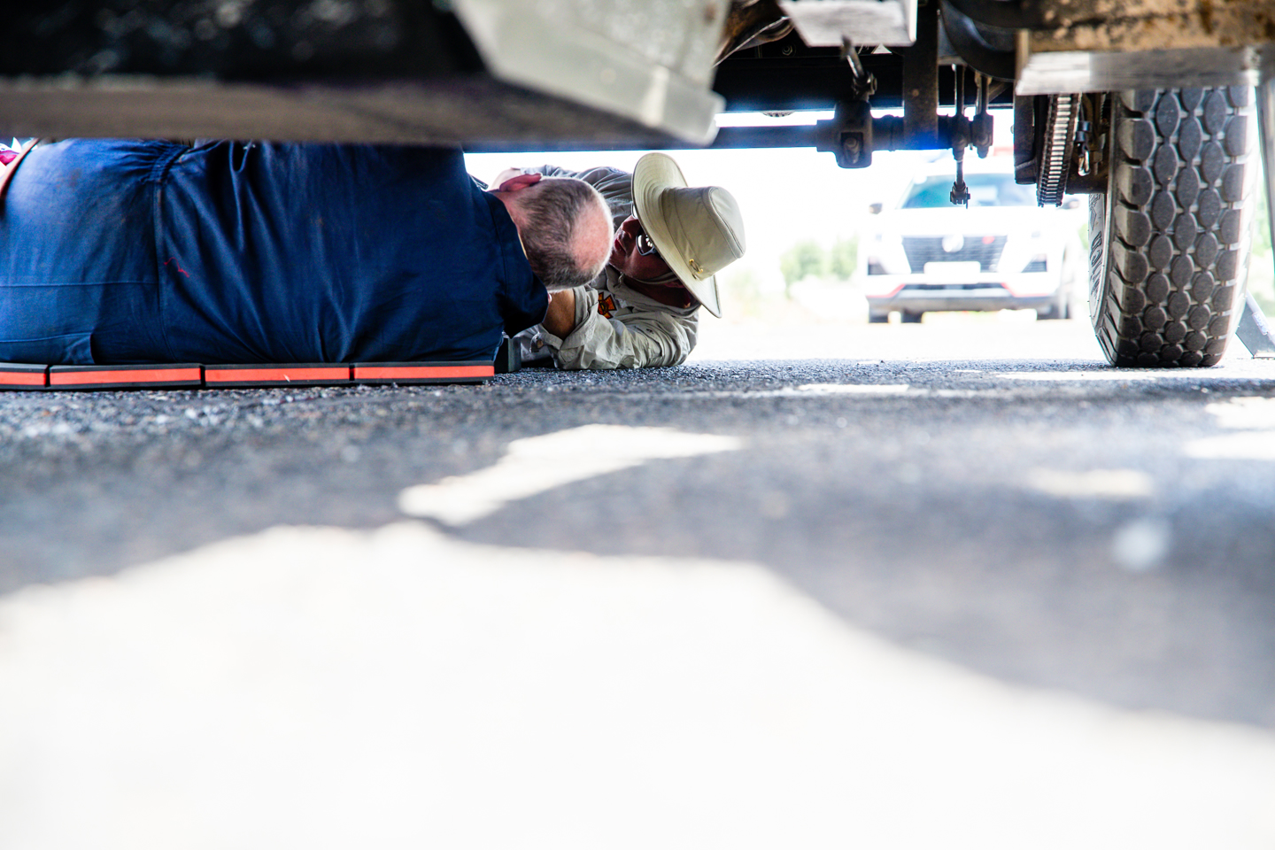 Just up the road, a few kilometres out of the next time control, there was a chain that hadn’t remained secure to its berth, the one transferring the drive of the engine to the wheels of the LaFrance, crewed by Tomas de Vargas Machuca and Ben Cussons. The gigantic beast had encountered some trouble with the secret police, well, secret sleeping policemen in any case, as the machine had encountered one of the extremely difficult to see Chinese speed bumps. The meeting had occurred at a fair old canter, and the impact had partially dislodged the drive chain from the rear sprocket, putting it under so much tension it was impossible to imagine a fix that didn’t involve cutting the chain in two. This put their progress for the day on ice, at least for a couple of hours whilst they enacted a repair. Incidentally, Tomas would like suggestions for a good Cobbler, after his shoe was set alight during the angle grinding phase of the repair process.