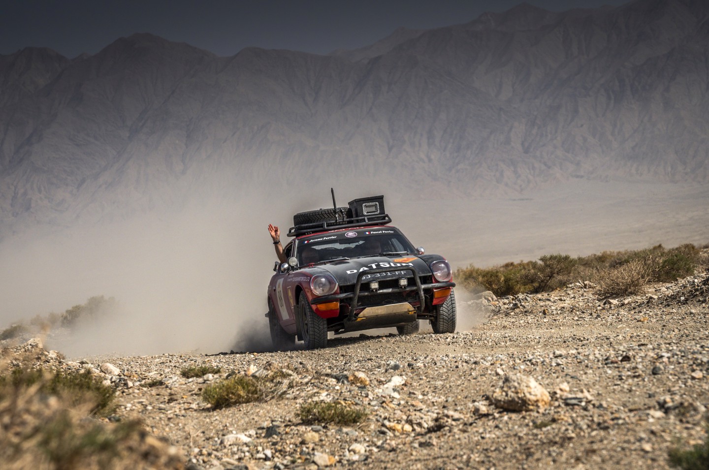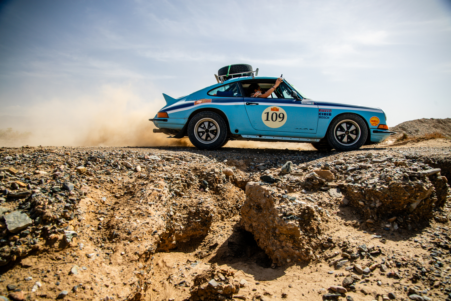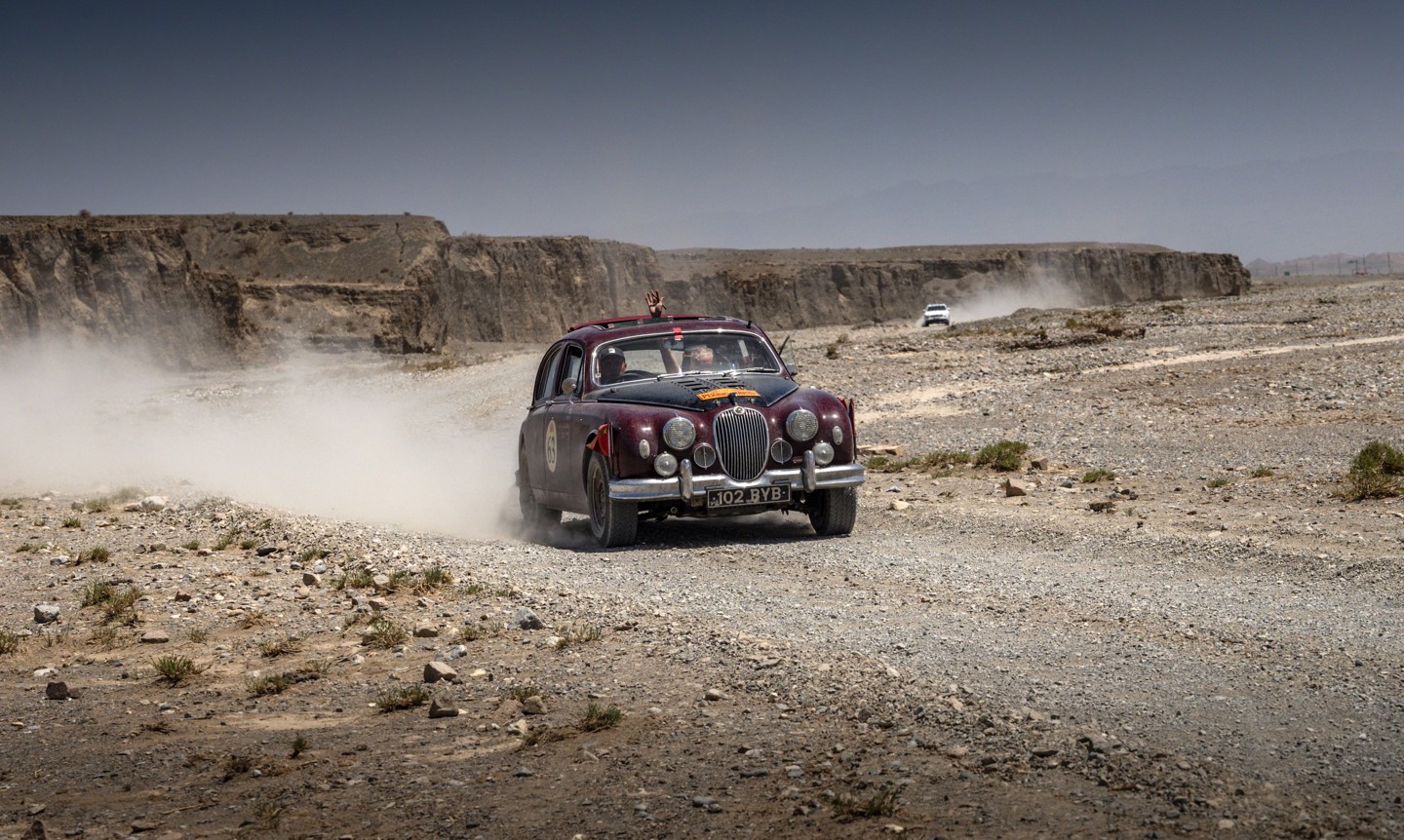 A number of crews had been enjoying the moment so much, that they had forgotten to fill up with fuel, and as legs were stretched at the MTC those who’s tanks were running dry were on the scrounge for petrol, so they could complete the 120km run into the hotel. The MTC was remote in every sense of the word, and the only road out of the place was a rough construction track that dropped down to the desert floor, and in the hot hot heat it was not somewhere to run out of fuel and become stranded. After much siphoning of petrol between vehicles, a lot of which came from Matt Bryson, the P76 turning Bowser for the day, everyone who had issues was able to get on with the job of negotiating the road home. It was an exercise in technical driving and patience, passable, but with some of the descents in and out of the numerous Wadi’s tricky to negotiate to say the least. It seemed that Florian Lissmann hadn’t read the script though, opting to go off piste and bury the throttle as soon as he was onto the desert floor.