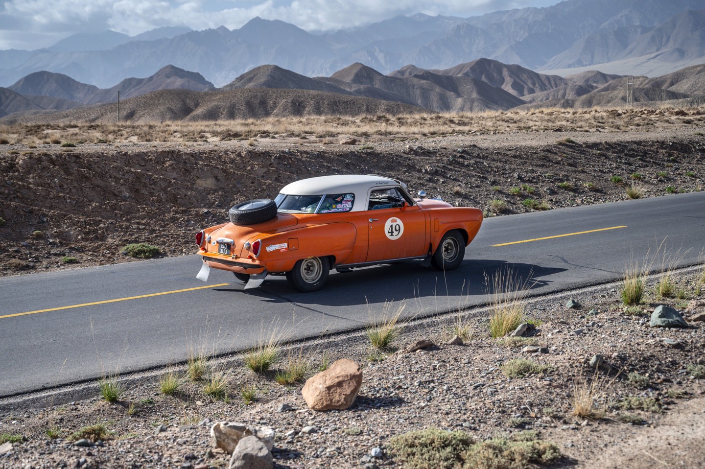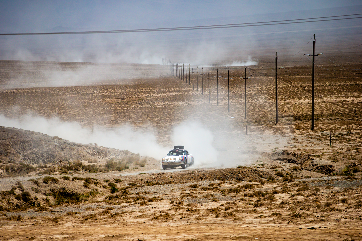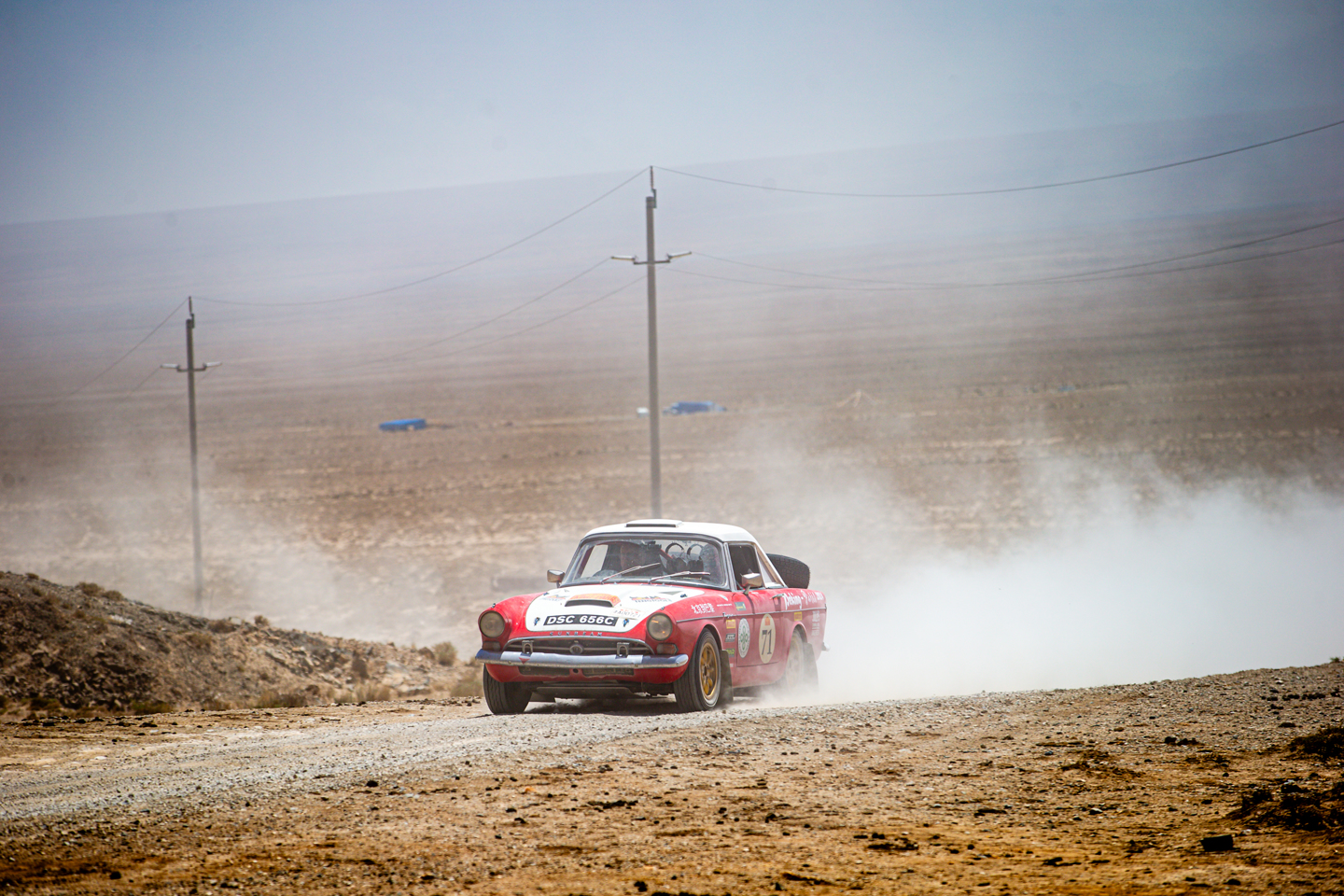 Anyone who wished they were still on the dirt wouldn’t have long to get back to the loose stuff though, as another 10km down the road we were back onto the gravel and into another series of dirt tracks and dry riverbed crossings as the scenery flipped again. As we approached the afternoons time control section the desert stretched out to the south of us, and above that loomed more distant mountains, with their 5500 metre peaks glistening white in the sunshine, as the cars tore up the sand and gravel into great dusty plumes below, as they enjoyed the sporting time control. There were no major dramas for anyone during this section, although John Henderson in car 99 managed to wrong slot just before the time control, but still got the car turned around and home inside his minute.
