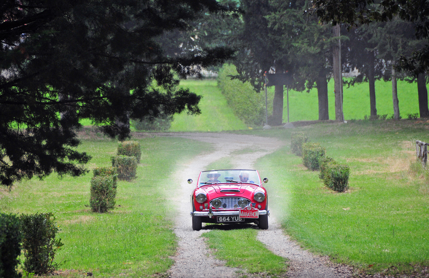 Following a fine showing on the Three Castles in their MGA, Mark & Sue Godfrey have brought their MGB Roadster to Italy and are currently in 8th, they are headed up by Chas Colton / Ryan Pickering who are rumoured to be seeking sponsorship from Flymo or Qualcast after their sprited attempt at the La Conca test saw them take to the grass, it was a bitter sweet start line for the ever cheerful Andrew & Sarah Mallagh, after driving down from Cheshire via a Porsche Club meeting in Germany, their immaculate 914/6 was parked close by to Andrew’s old Porsche 911 – now an Arrive & Drive car and caused him to cast a wistful glance or two in the 911’s direction. Alexander & Jane Postan were going well in their supercharged 962cc Austin-Healey Bonneville Sprite, sadly though a gasket blew between the blower and engine dropping them down the leader board and giving Alexander the task of making a new gasket witht he aid of some liquid metal.
