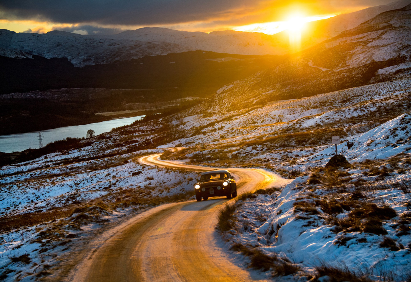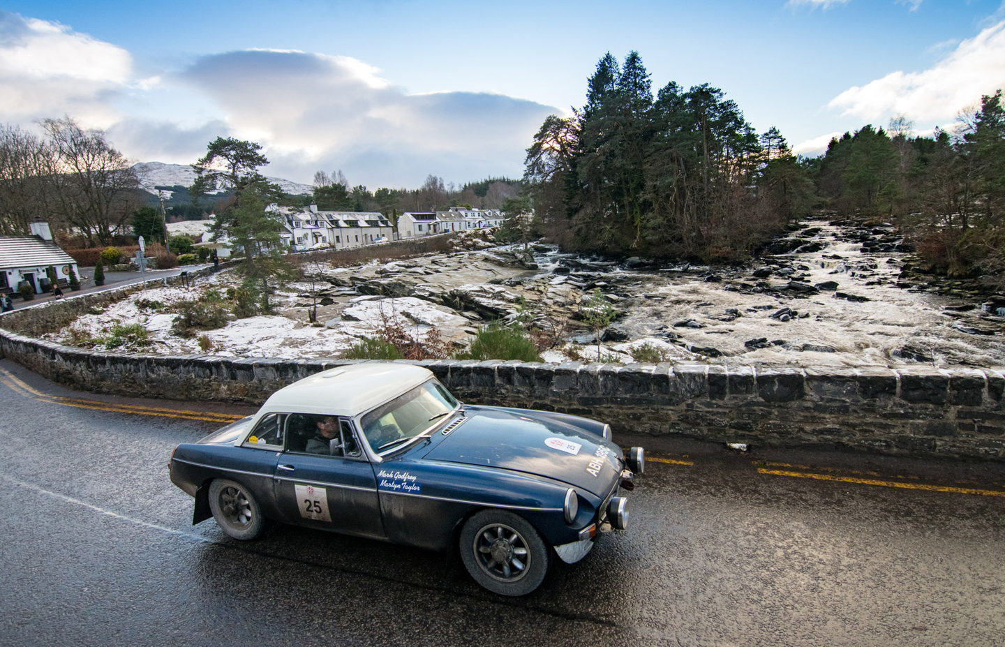 The second regularity of the day was another straightforward offering named Loch Glow, this would use lowland forestry lanes as its backdrop before finishing close to Loch Leven nature reserve. Navigation was by Jogularity with a small square of map presented to aid crews along the route. Heading north and into more interesting territory, the final test of leg four was held at the Edinchip Estate and proved to be very demanding with its loose surfaces providing the drivers with some really demanding conditions to get their teeth into. Lunch was taken at a Le Jog favourite, the Killin Hotel before what would turn out to be one of the sternest challenges of the day, a four timing point 12-mile section over the notorious Bridge of Balgie. The weather was horrible at height which had made the road surfaces incredibly slippery, this wasn’t helped by the recent incoming snow that made the section so difficult to maintain speed. Navigation wasn’t difficult, however the first timing point was there to check accurate navigation and use of the crews’ tripmeters. Situated on an unmarked triangle, the more experienced navigators pre-guessed that this would be a timing point due to the instructions coming so close together. Further along the road crews came across Lawers Dam at Lochan na Lairige which was built in 1956 to serve the crofters of the area with power. How tough an existence it must have been for these hardy folk, their crofts or ‘Shielings’ as they are called can still be seen scattered across the hillside in various locations. Dropping down the valley between Meall nam Maigheach and Creag Dhubh, the second timing point appeared at Milton Eona where the road changes character totally from the previous two timing points. Following the course of the River Lyon, a further three timing points challenged the crews with. Several crews couldn’t complete the section with one of the more notable ones being Kevin Haselden/Bart den Hartog and Richard Harrison/Peter Boyce