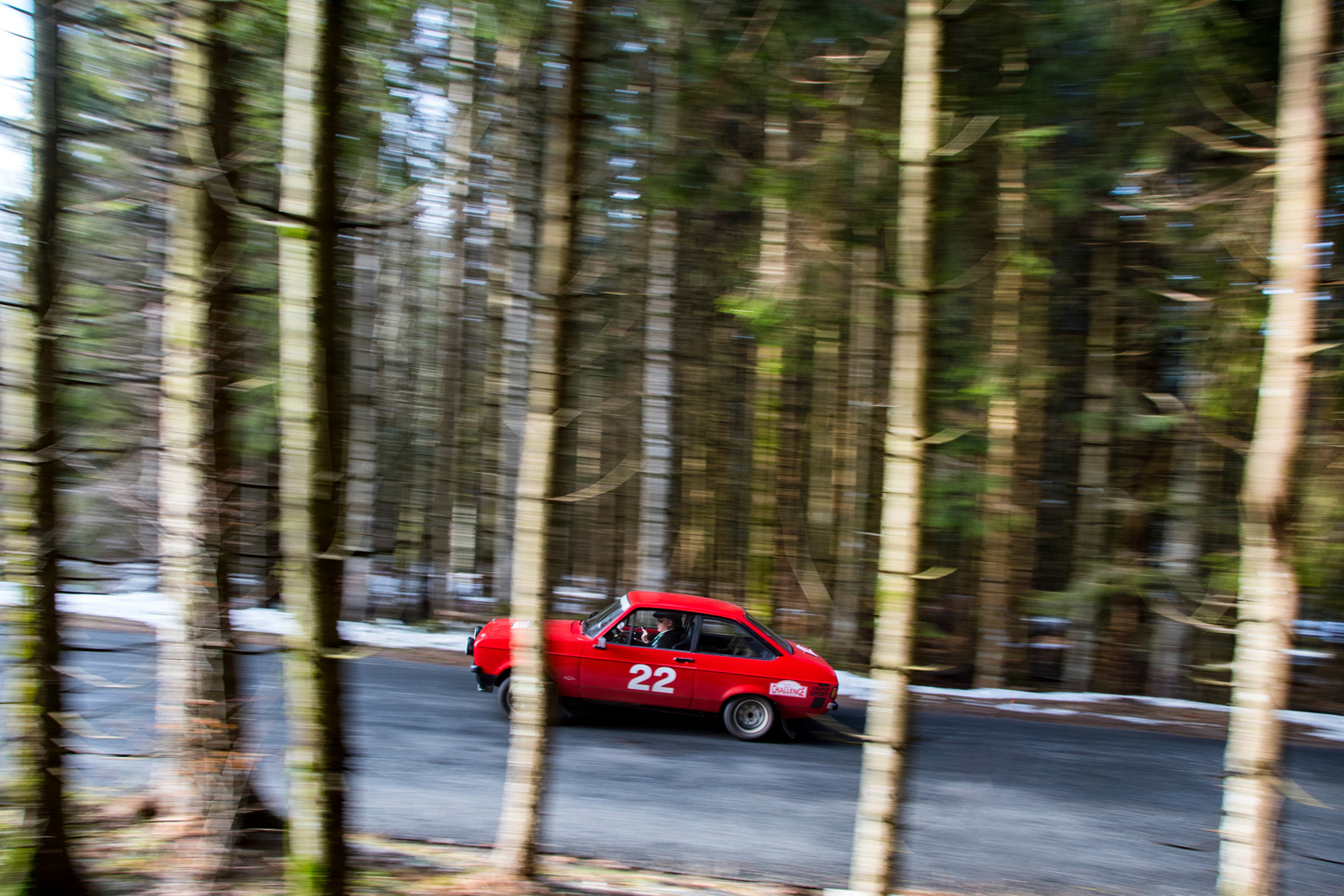 RS 2/5 took crews back into the snow and caught many out before the first timing point with snow covering the entrance to the desired road meaning crews had to venture down to ascertain if there actually was a road there. Perkins/Fish came in very hot into the first TP after missing this and almost slid off the road after their front wheel hit the verge and dragged them towards some trees, other crews that were really pushing here were Peter and Pat Neville and Paula and Mike Donald, wheels locked seemed to be the order of the day on this broken surface section of road. The route wound its way through the Forêt Du Comble with much of the road covered in snow that had frozen making progress tricky and needing deft touches on the steering and throttle at times to keep pointing in a forward direction. One crew who struggled here were Liam Hammond/Mark Simpson who’s Rover’s tyres weren’t up to the snow and left them needing a tow from the closing car to get up a hill... Carnegie/Bosdet heaped the pressure on with a fine two points dropped but Bloxidge/Canavan countered this with a one-second penalty for the whole regularity. Olaf Pothoven/Pieter van Leusden were spectacular in their Escort 1600 Sport, fishtailing beautifully through the woods and keeping great time with just seven- seconds dropped.