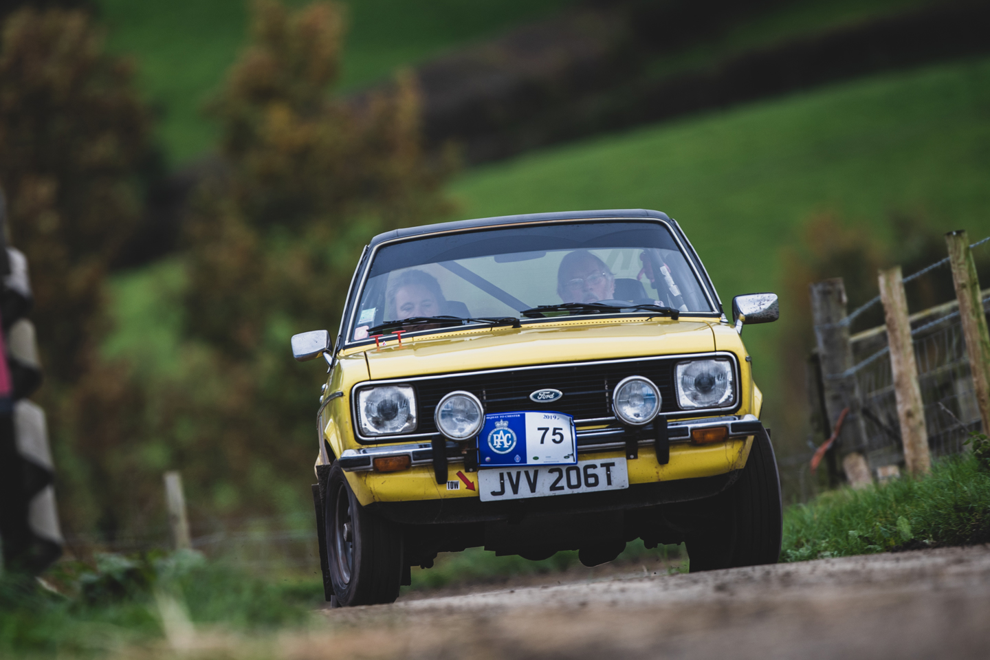 Hard but fast for crews as they headed into torrential rain and biting winds over the top of Leek and into two airfield tests with visibility an issue for some in the inky black night. The Roaches was a spectacular regularity, the sixth and last of the day with a blast across a muddy and rocky farm yard with a fast right though a gate which revealed a timing point which literally threw Harm Lamberigts and Arjan van der Palen’s Dutch Escort Mexico into a full blooded slide on sight of the control. The leading Mini Cooper S of Entwistle and Appleton came through first chased by the Opel Ascona of another Dutch crew, Alexander Leurs and Bas de Rijk. The Ginetta G15 of Mike and Matthew Vokes arrived at the timing point just a bit ahead of the Porsche 911 of Phil Hindley and Martyn Taylor whilst Bill Cleyndert and Tony Brooks momentarily turned up towards the forty cows feeding in the sheds above the yard. It was that sort of exciting night, except that the blockbuster Time Control Section was last on the day two menu.