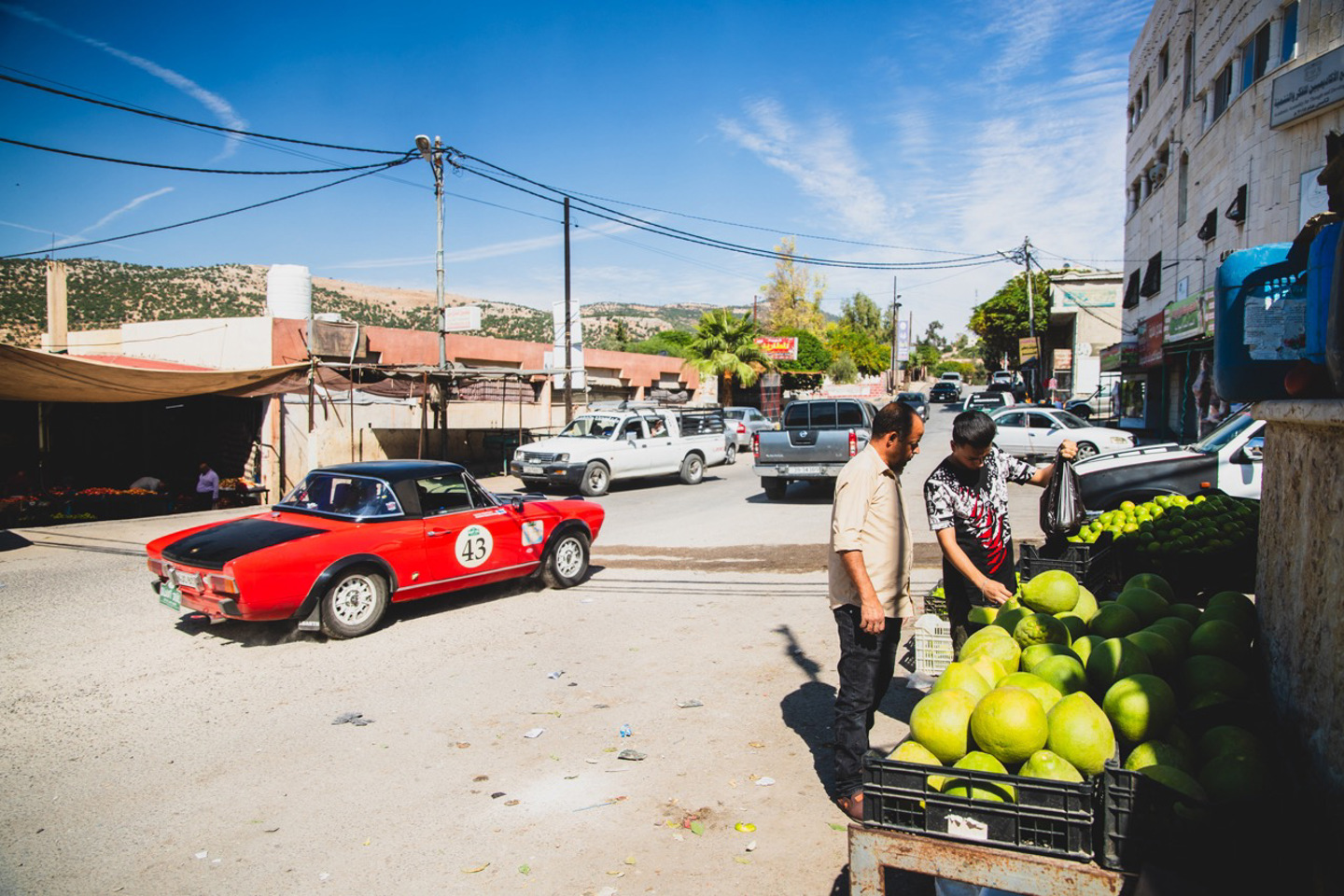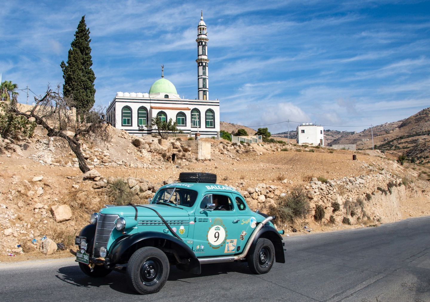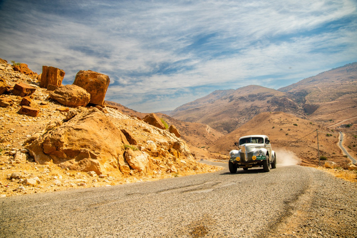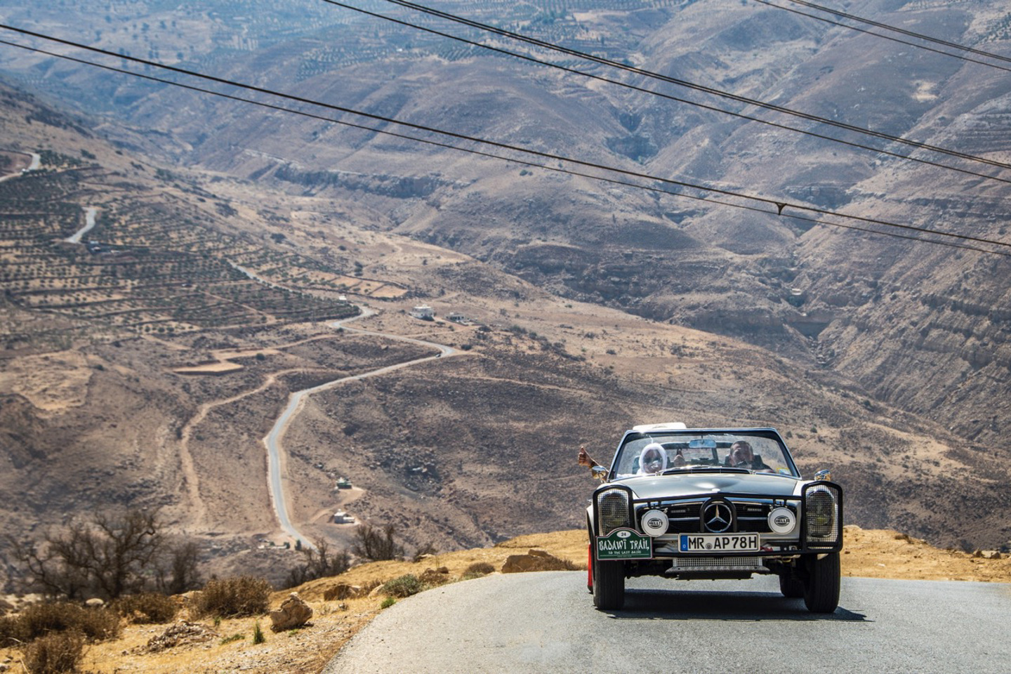 There were a few experiences with members of the public today, some positive and some less so, particularly with one or two groups of over-excited school children. Most though were just delighted to see the cars, and looked on in amazement, with the older cars and noisy Porsches in particular causing a stir. There was traffic to deal with as well, with the towns of Afloun and Kuranjah adding some excitement before lunch, buzzing with Jordanians going about their day as horns sounded and policemen blew their whistles as they directed traffic. There will be plenty of times in the days ahead where we will see precious few people in the wilderness of the desert, so on days like these, it’s nice to take in the flavour of the places our hosts call home, especially those settlements that are off the tourist trail.
